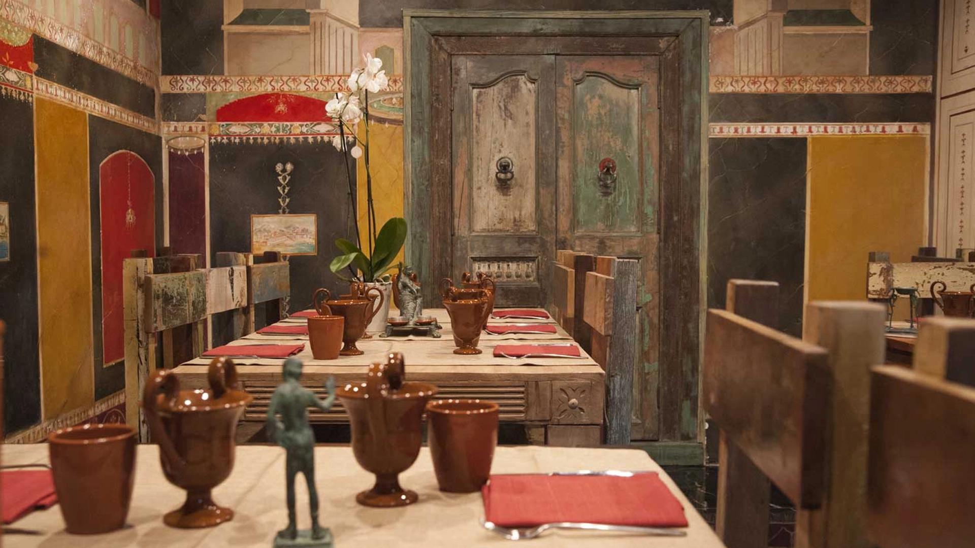 I thermopolia, piccoli esercizi di ristorazione simili a moderni bar o trattorie, erano disseminati ovunque nella città. Vi si servivano pasti caldi a base di legumi, carne stufata, pesce marinato, accompagnati da pane e vino giovane. I contenitori in terracotta incassati nei banconi dei thermopolia conservavano cibi cucinati che i clienti consumavano sul posto o portavano via. L’enorme quantità di questi luoghi testimonia una città dinamica, laboriosa, con una forte componente urbana che si affidava alla cucina esterna per ragioni di spazio e praticità.